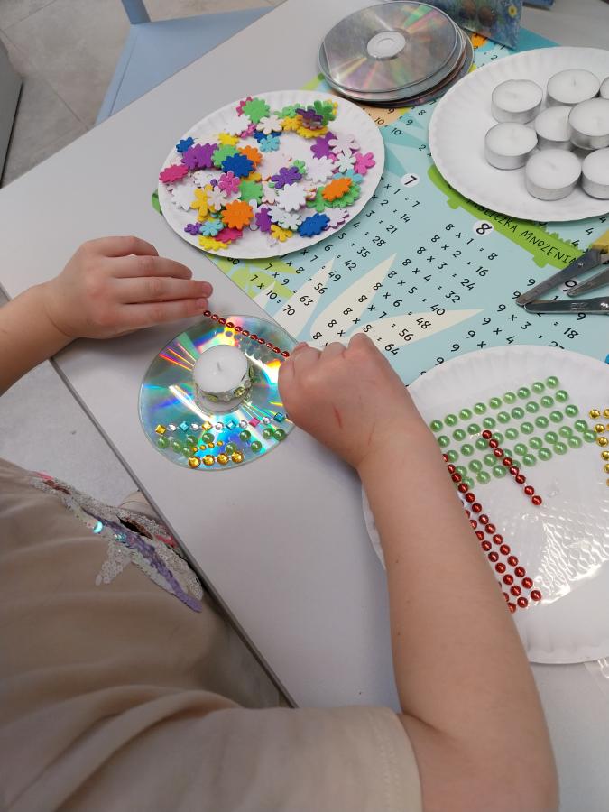 Tradycyjnie podczas zajęć dzieci wykonywały równie pracę plastyczną – tym razem był to świecznik ze starej płyty CD, który ozdobiły różnymi drobiazgami. Jak możecie się domyślać, został dodatkiem do prezentu na Dzień Mamy.