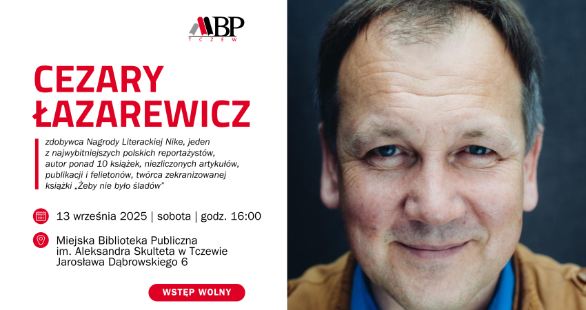 Miejska Biblioteka Publiczna im. Aleksandra Skulteta w Tczewie serdecznie zaprasza na spotkanie autorskie z Cezarym Łazarewiczem – polskim dziennikarzem prasowym, publicystą i pisarzem, działaczem opozycji demokratycznej PRL, laureatem Nagrody Literackiej Nike.
