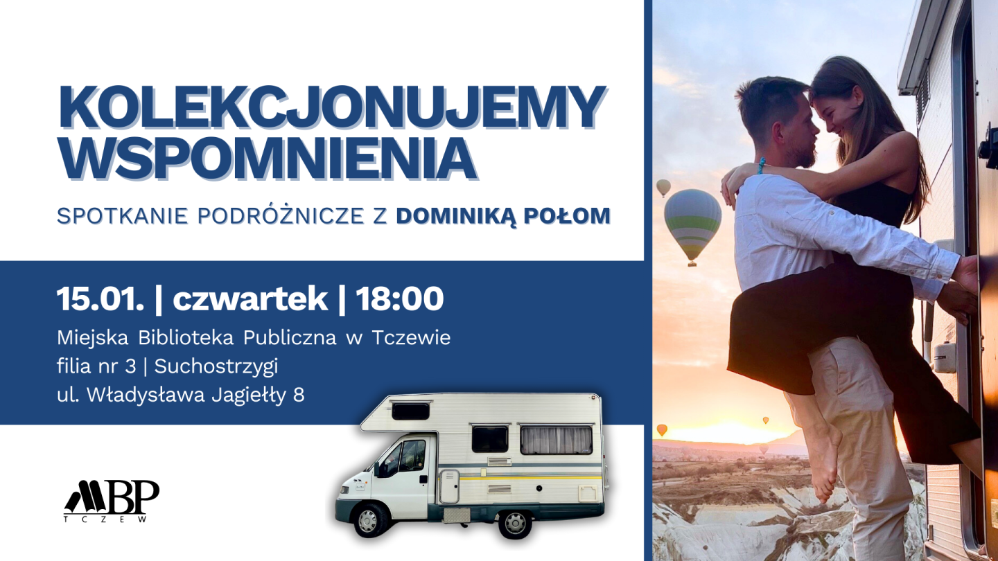 W czwartek, 15 stycznia, zapraszamy na spotkanie z Dominiką Połom, która opowie nam o codzienności spędzanej w podróży z mężem i życiu na czterech kołach kampera.