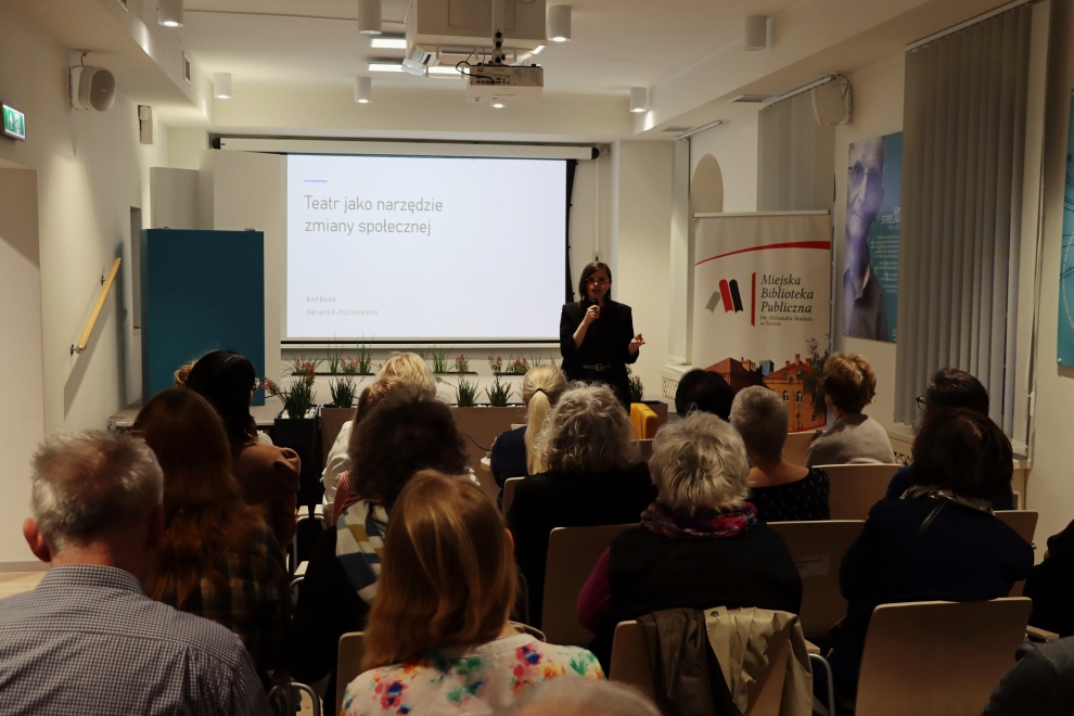 We wtorek, 17 marca, w progach biblioteki na J. Dąbrowskiego 6, mieliśmy ogromną przyjemność gościć teatrolożkę Barbarę Świąder-Puchowską. Spotkanie dotyczące teatru jako narzędzia zmiany społecznej, otwierało nowy cykl spotkań zatytułowany „Kulturalnie o kulturze”. Nie mogliśmy sobie wyobrazić lepszej inauguracji. Prelegentka przedstawiła czemu w momentach kryzysowych ludzie sięgają po teatr oraz jak działania teatru zaangażowanego zmieniały się na przestrzeni XX wieku, ostatecznie omawiając konkretne przykłady grup teatralnych tego nurtu. Dawce wiedzy towarzyszyła interakcja z publicznością, gdzie odbiorcy chętnie udzielali odpowiedzi i dzielili się refleksją.